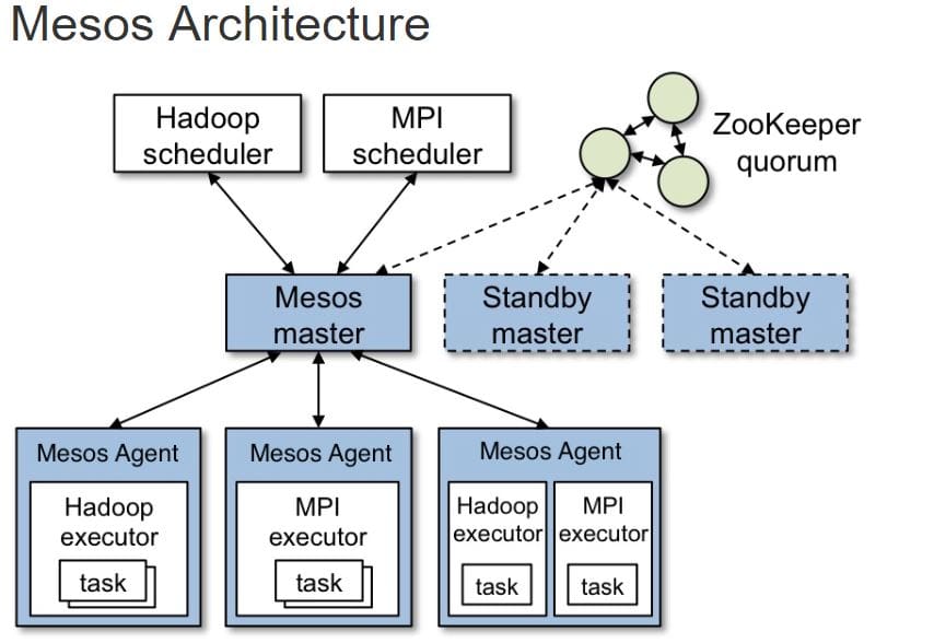 Since any failure in master results in the loss of state about resources and tasks, we deploy it in high availability configuration. As can be seen in the diagram above, Mesos deploys standby master daemons along with one leader. These daemons rely on Zookeeper for recovering state in case of a failure.