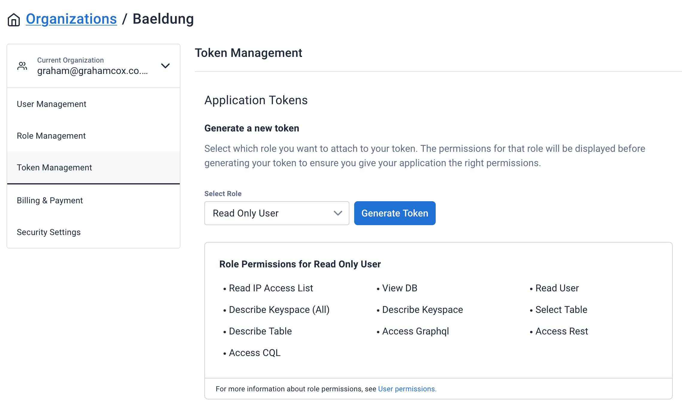 We also need to have some client credentials in order to connect to our database. Unlike the APIs that we’ve used in previous articles, which use an access token, the CQL API requires a “username” and “password”. These are actually a Client ID and Client Secret that we generate from the “Manage Tokens” section under “Organizations”: