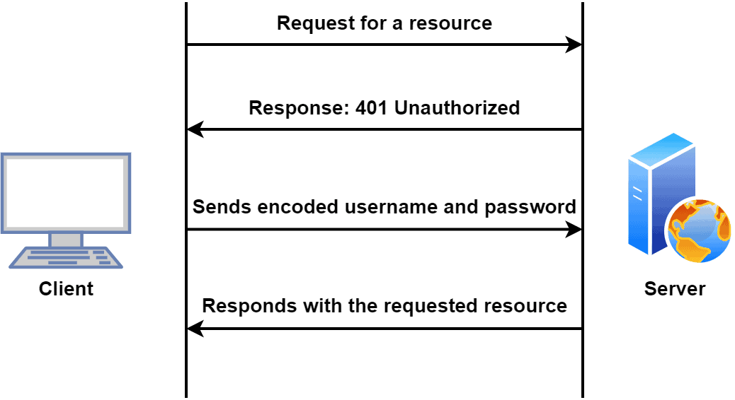 When the client receives the status code, the user is asked to provide the username and password. Upon receiving the username and password from the user, the client encodes the information using the Base64 method. Finally, the client sends another request, including the encoded credentials.