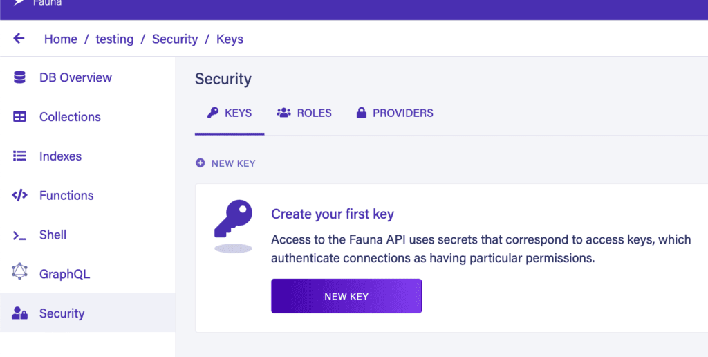 Finally, in order to connect to the database from outside, we need an authentication key. We can create one from the Security tab on the sidebar: