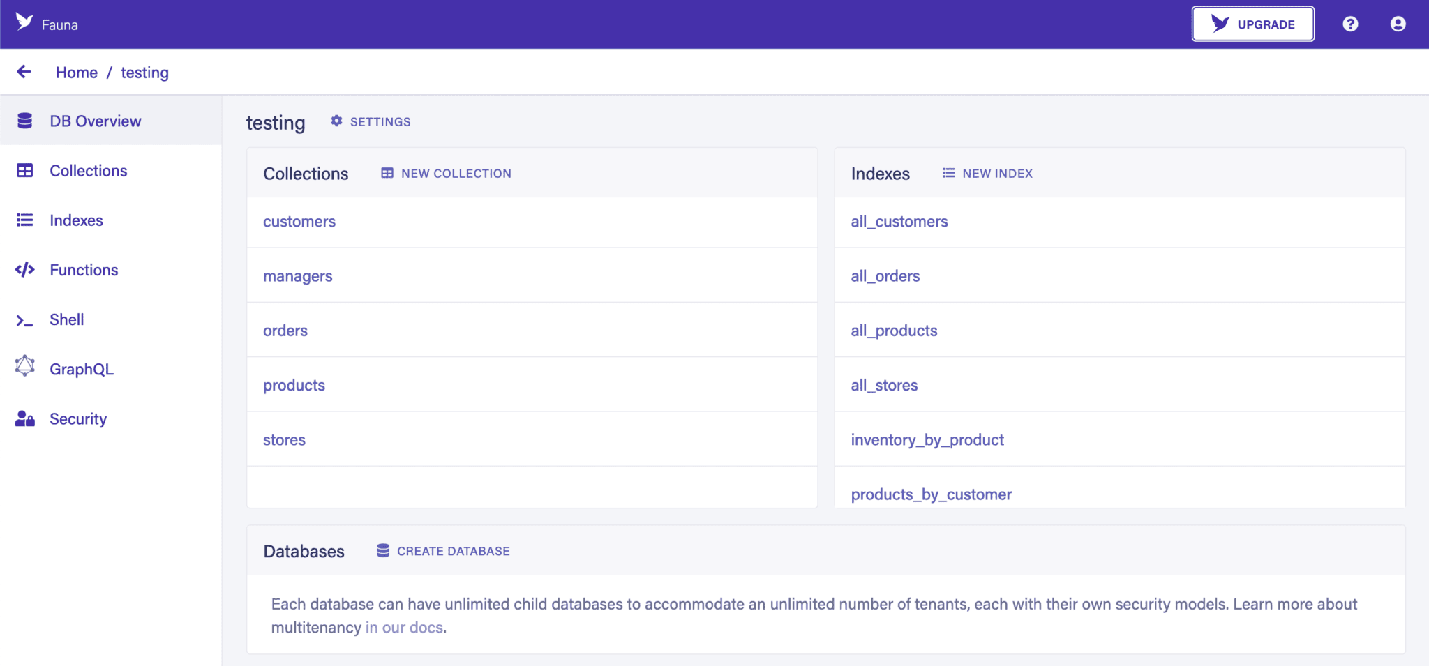 It is possible to create databases that are themselves children of other databases. We can then create credentials for accessing these child databases. However, where Fauna is different is that we can perform read-only queries against data from child databases of the one we’re connected to. However, it isn’t possible to access data in parent or sibling databases.