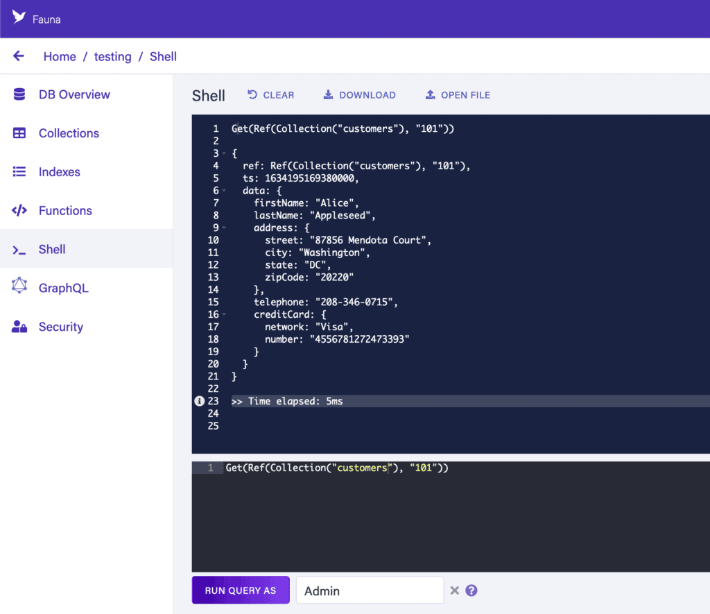 The Fauna Shell allows us to execute any commands from within the web UI. We can do this using any of our configured keys — acting exactly the same as if we’d connected from outside with that key — or else as certain special admin connections: