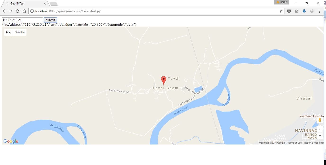 When the form is submitted, we will make an Ajax POST request to the Spring Controller to retrieve the JSON Response with geolocation data: