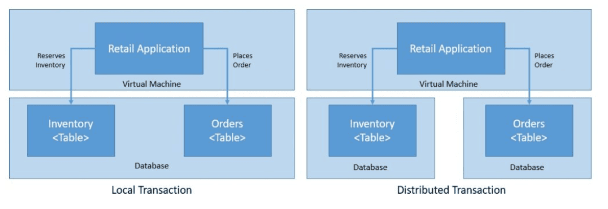 Transactions within a single resource are known local transaction while those spawning across multiple resources are known as the distributed transaction:
