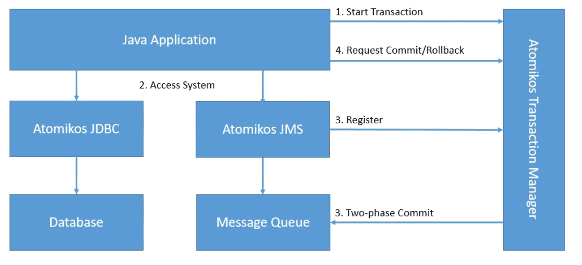 Atomikos is built primarily as a JTA transaction manager and, hence, implements XA architecture with a two-phase commit protocol. Let’s see a high-level architecture with Atomikos: