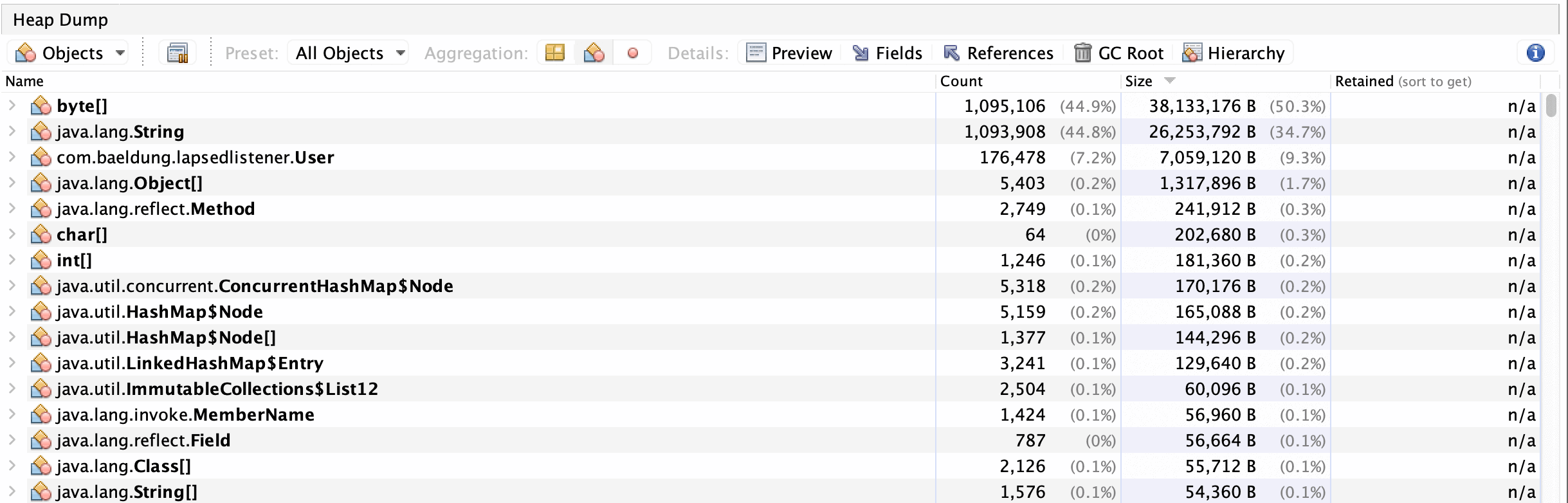 After capturing a heap dump, we can review and analyze it. In our case, we’ll try to find alive objects that should not be there. Luckily for us, VisualVM produces a summary for a heap dump, showing important information: