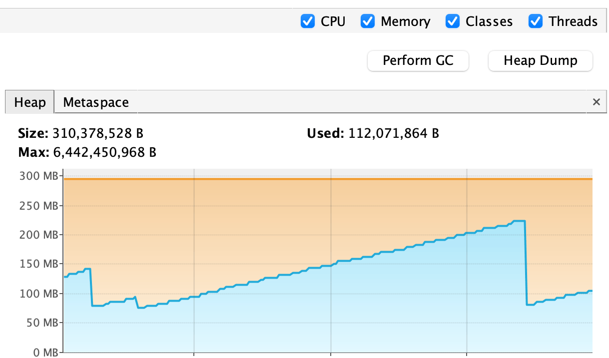 The first giveaway is that the used memory monotonically increases over time. This isn’t always a sign of a memory leak. However, on an application like ours, increasing memory usage might be a good sign that we have a problem.