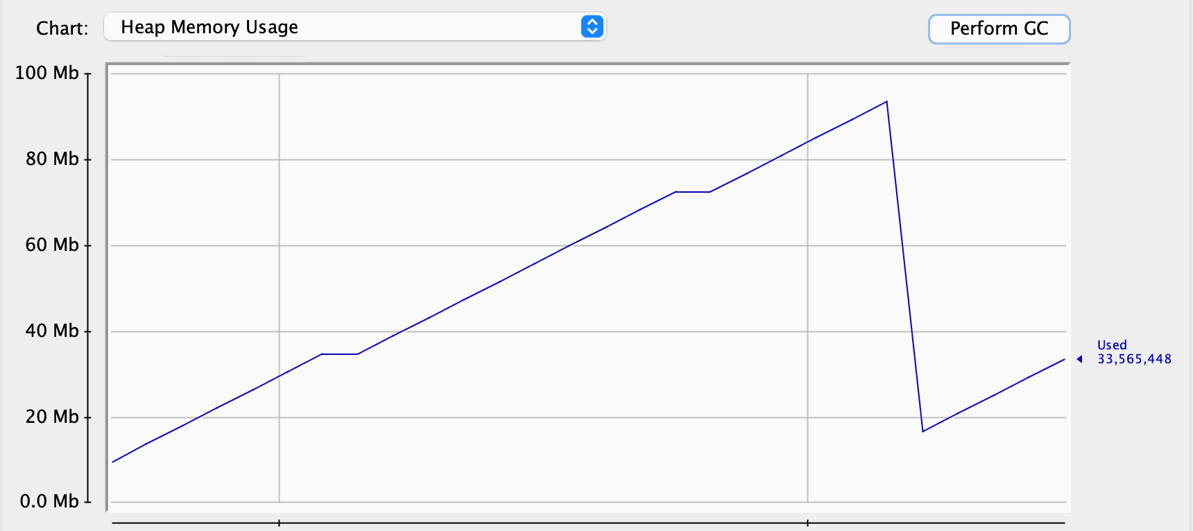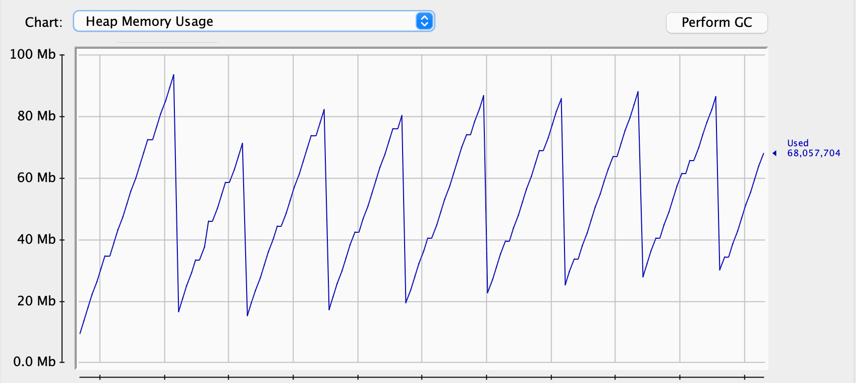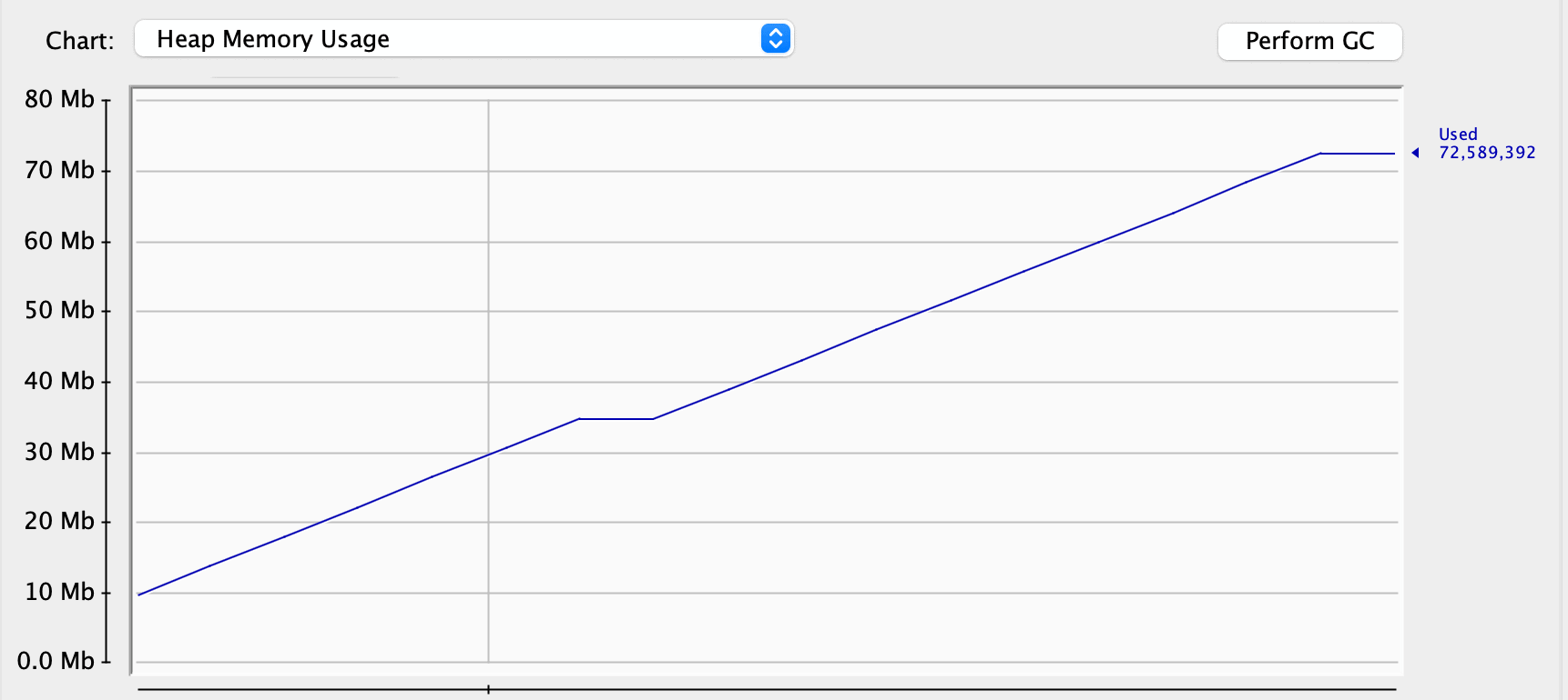 However, memory usage isn’t always the sign of a memory leak. Let’s try to hint the garbage collector to clean up some dead objects: