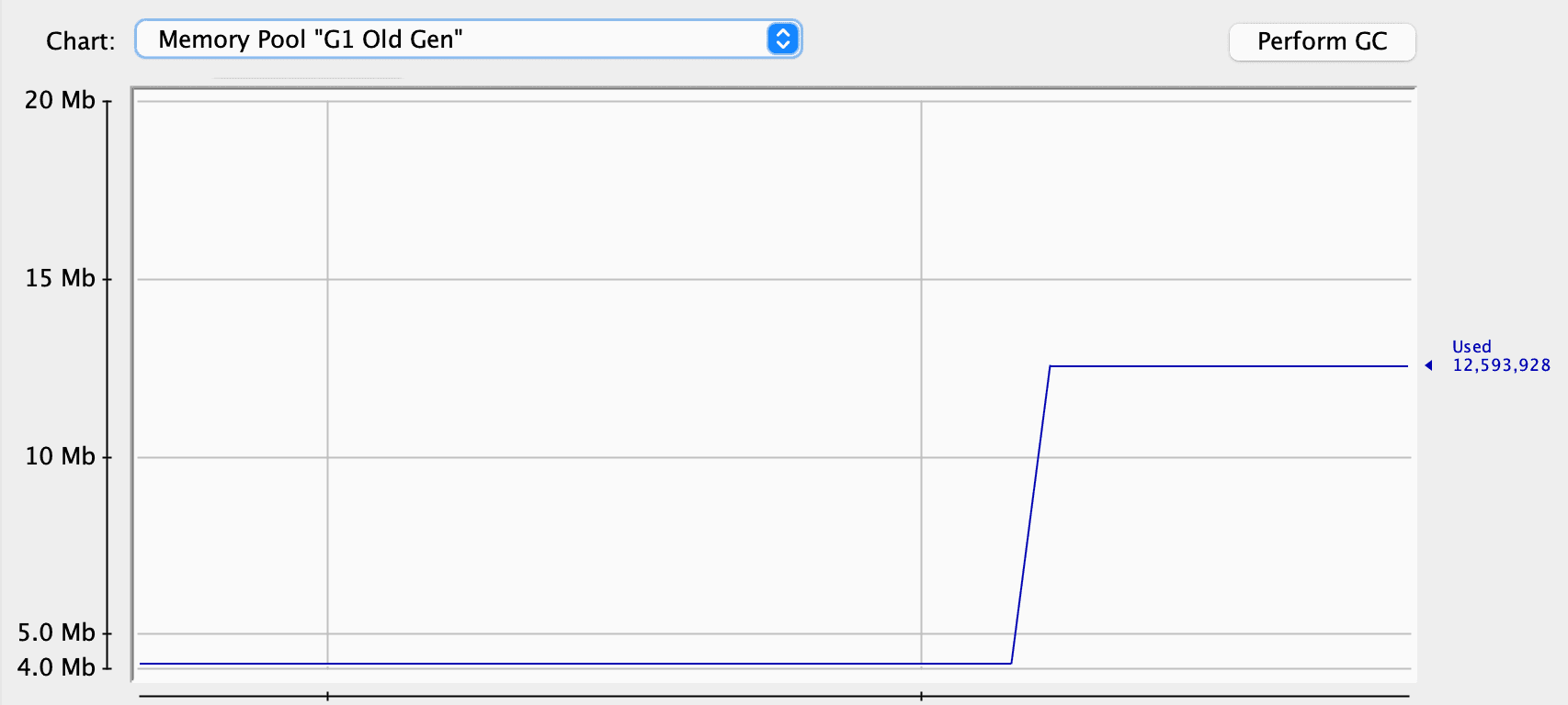 As we can see, the garbage collector worked quite well and cleaned up some space. Thus, we can assume that we don’t have any problems at all. However, let’s look at the Old Generation. This is the space for objects that survived several garbage collections in our application for some time. We can see that it constantly increases in its size: