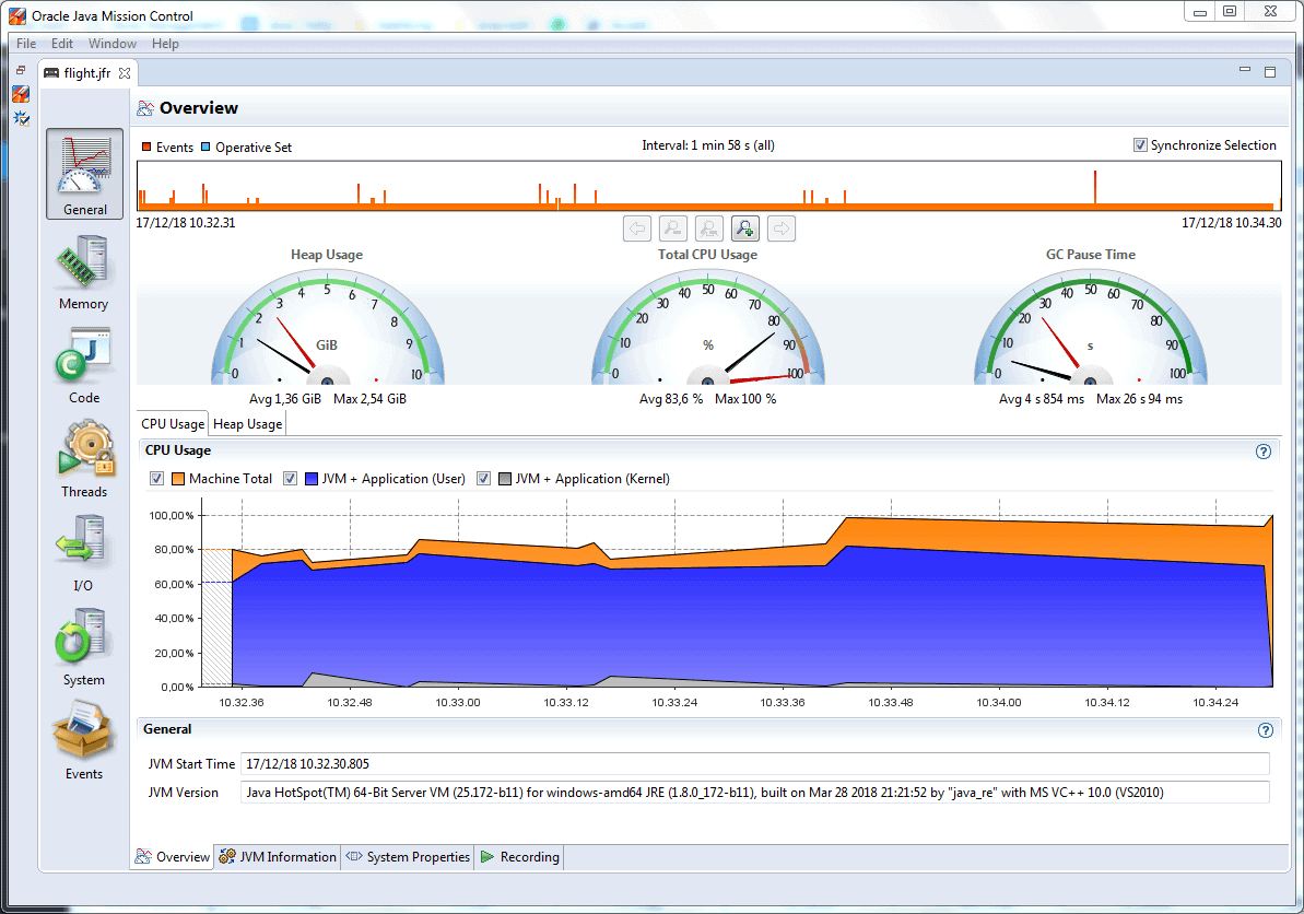 Now, we feed the file flight.jfr to Java Mission Control, which is part of the JDK distribution. It helps us visualize the data about our events in a nice and intuitive way.