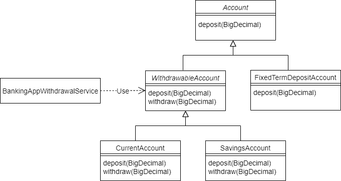 Because all accounts do not support withdrawals, we moved the withdraw method from the Account class to a new abstract subclass WithdrawableAccount. Both CurrentAccount and SavingsAccount allow withdrawals. So they’ve now been made subclasses of the new WithdrawableAccount.