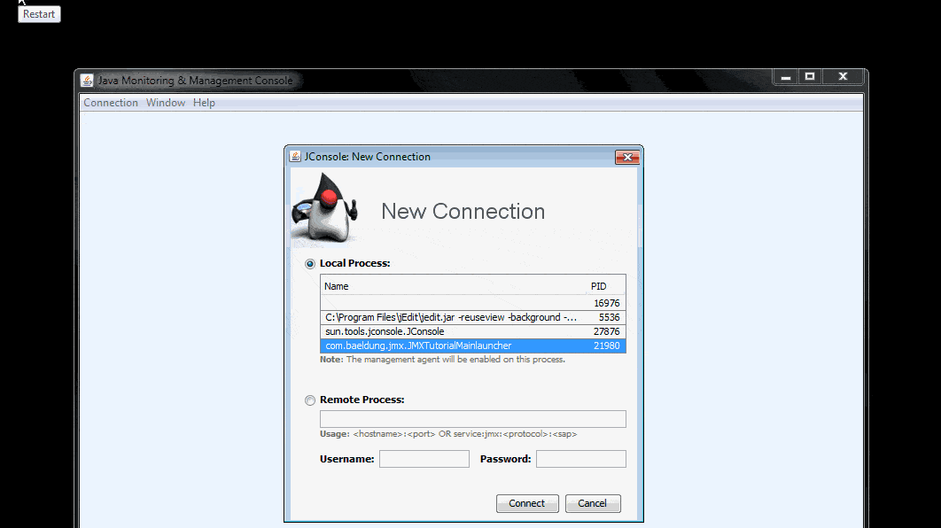 - Start Jconsole (located in the bin folder of the JDK installation directory of your machine)