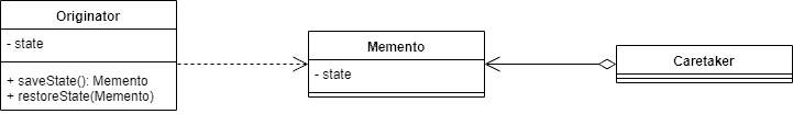 As we can see, the Originator can produce and consume a Memento. Meanwhile, the Caretaker only keeps the state before restoring it. The internal representation of the Originator is kept hidden from the external world.