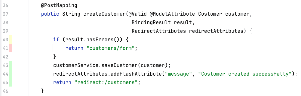 In this case, we can see that line 6 is colored in yellow. Only one branch of the ‘if’ condition is tested and runs in our simple test. Therefore it’s not completely tested and marked in yellow.