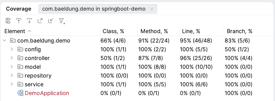 We can see a summary of the test coverage where it displays how much code is covered under unit tests in class level and package levels: