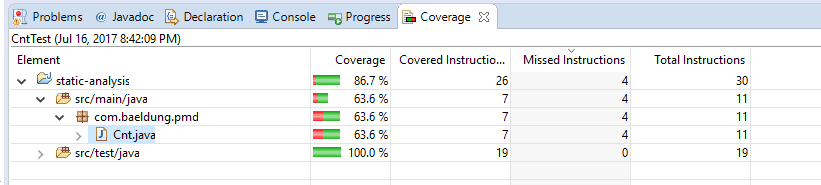 Similar to Eclipse, JaCoCo displays results using different color schemes for the coverage.