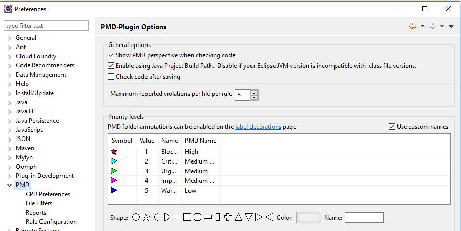 We can set the behavior of the PMD plugin from the settings page, by going to File -> Settings -> other settings -> PMD to view configuration page. From the settings page, we can configure the rule set by loading a custom rule set with our own testing rules.