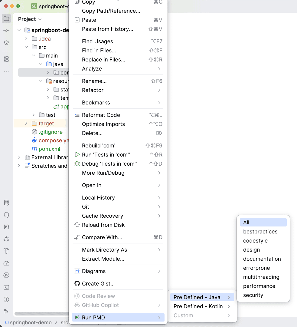 We can similarly run the plugin right in the IDE – by right-clicking the source we need to scan and selecting PMD scan from the context menu: