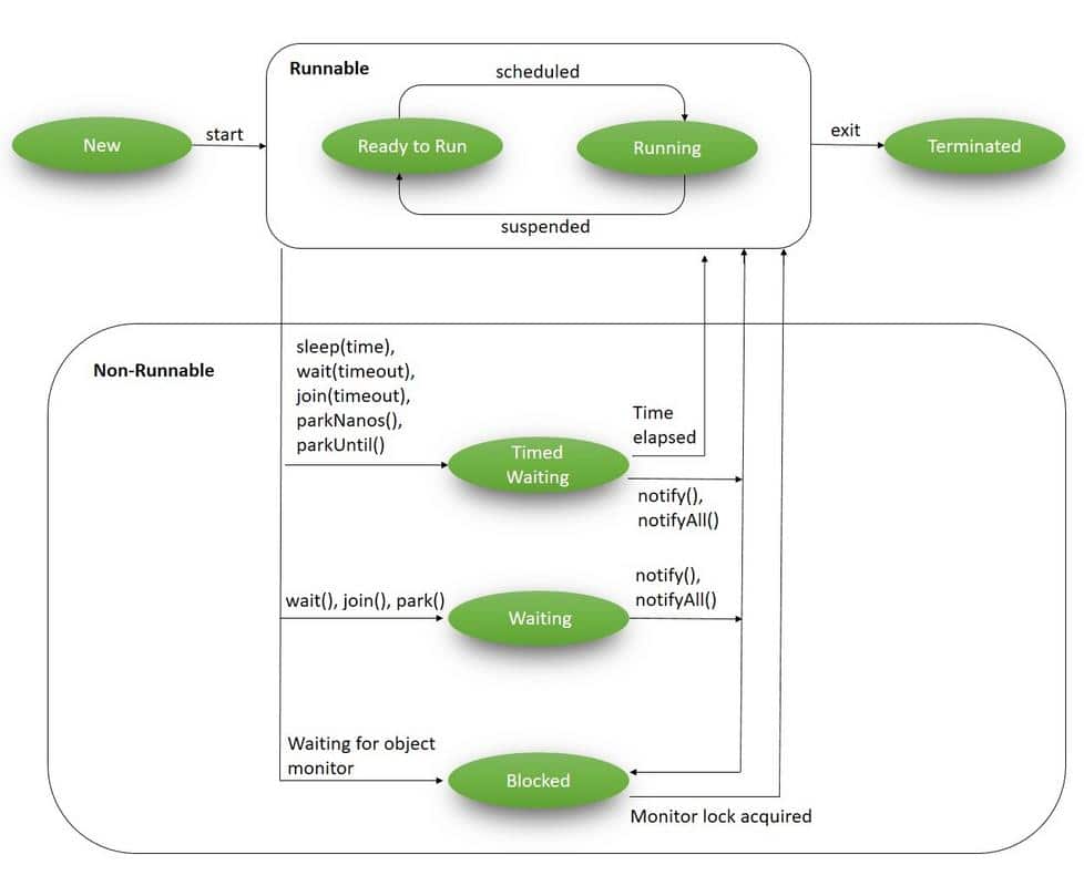 In the Java language, multithreading is driven by the core concept of a Thread. During their lifecycle, threads go through various states: