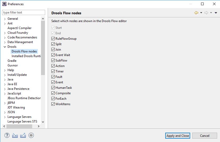 Once Eclipse restarts, we’ll need to go to Windows -> Preferences -> Drools -> Drools Flow Nodes: