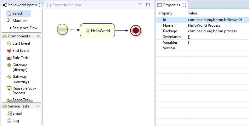 Let’s create a small BPM process model that prints “Hello World” in the console.