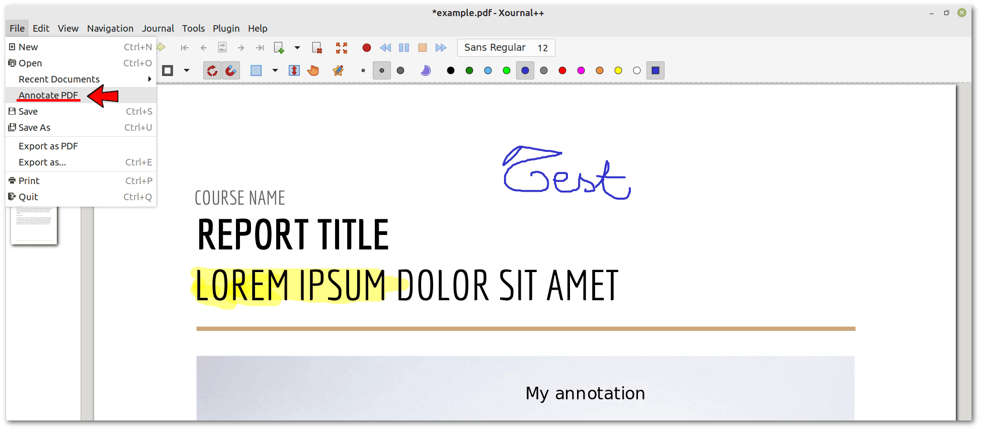 Xournal++ PDF AnnotationsWe can then export the annotated PDF as a new PDF file, but there is no way to edit our annotations in the resulting PDF. If we want to edit our annotations, we need to save the document in the native Xournal++ format, which has a .xopp extension and must be saved along with the original PDF. We can find more information in the official Xournal++ documentation on PDFs.