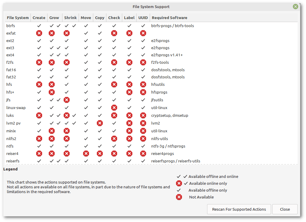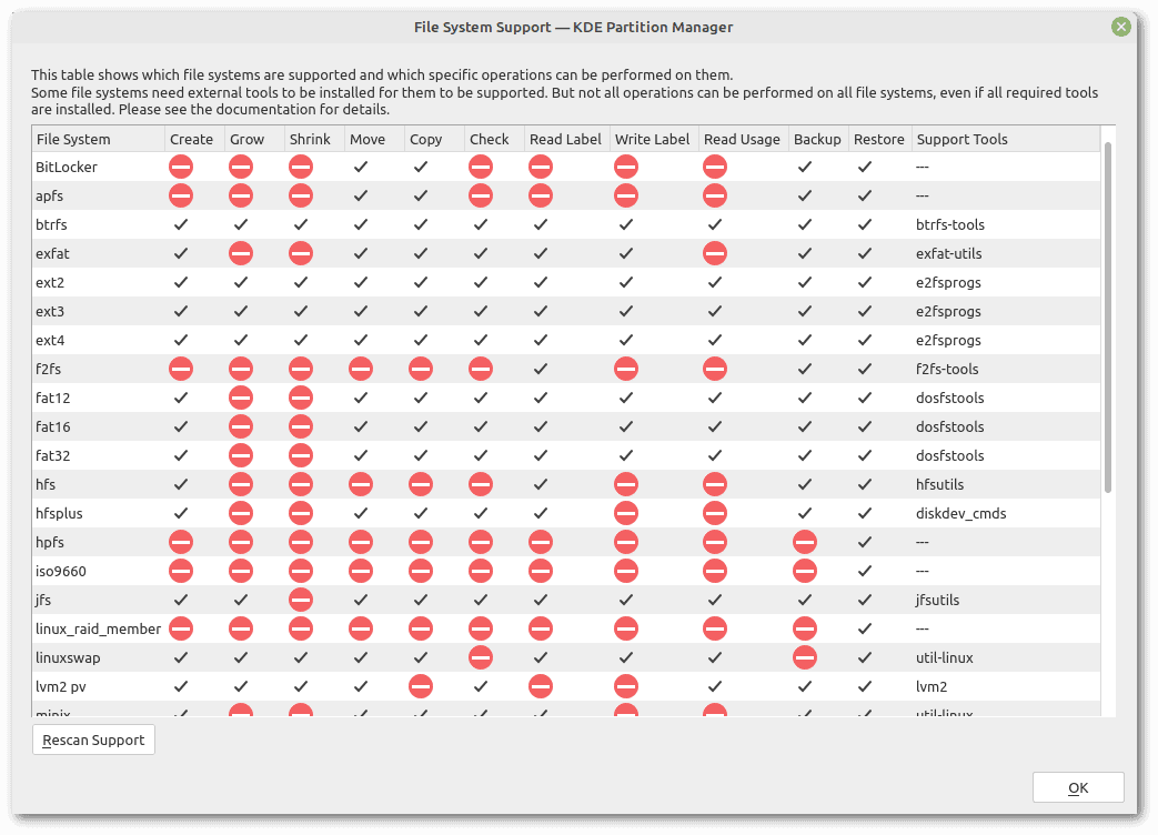 KDE Partition Manager - Example of usageSimilar to GParted, it can show a table indicating the type of support for each file system. Let’s note that this support slightly differs from that of GParted. For example, while GParted allows us to grow and shrink FAT32 partitions, KDE Partition Manager does not: