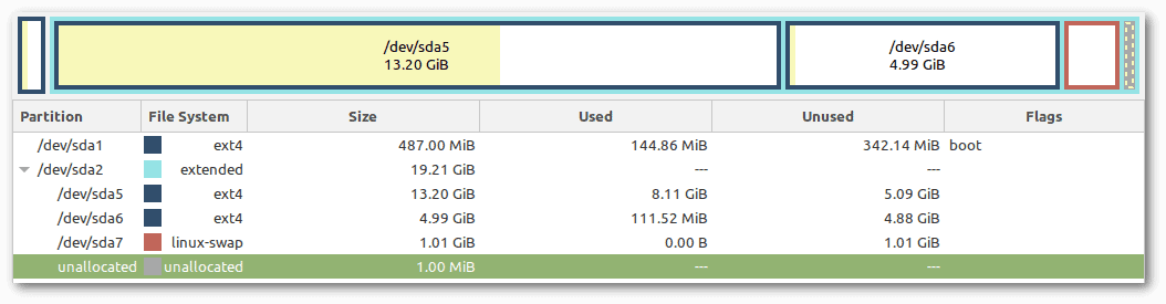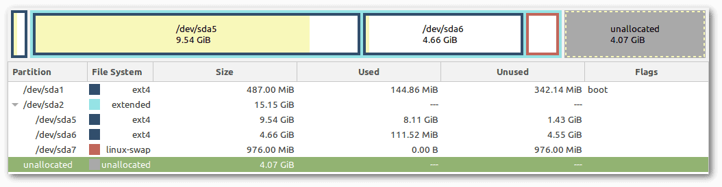In this case, we made sure to enlarge the extended partition by occupying the free 4GiB. Free space at the end of the disk typically occurs when we enlarge a virtual disk.