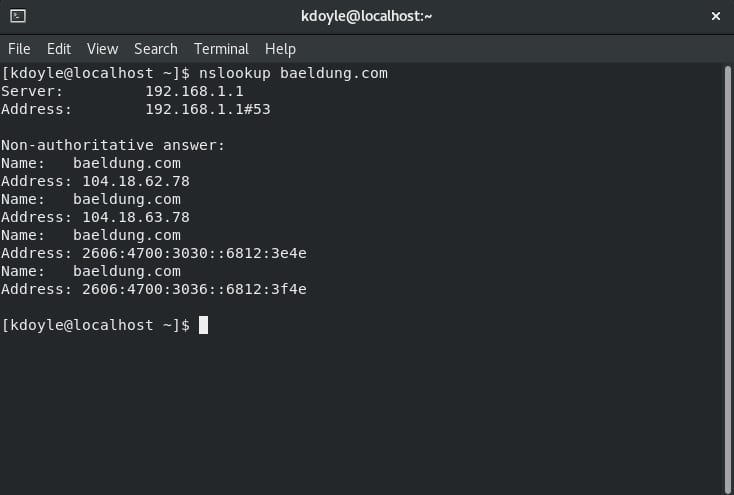 [kdoyle@localhost ~]$ nslookup -type=a baeldung.com