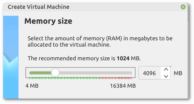 Let’s choose a sufficient amount of RAM for the virtual machine. As a rule of thumb, we should place the slider only inside the green part, which depends on the amount of RAM of the host machine: