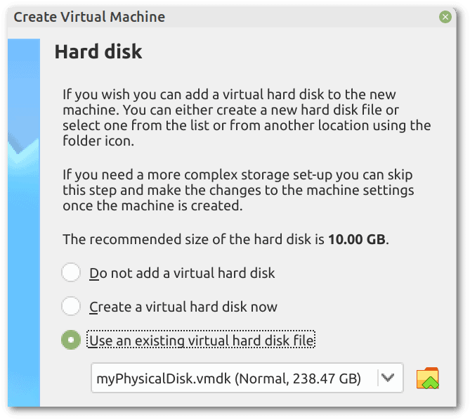 Then we need to create a file with the .vmdk extension, which uses VMware’s open-source format. We’ll treat this file as if it were a regular virtual disk to be inserted into a VirtualBox machine. However, it will have the effect that reading and writing data will occur from the physical disk /dev/sda: