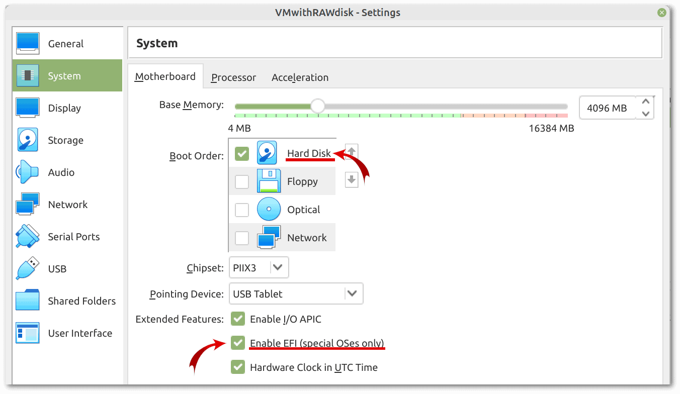 Previously, we saw that the physical disk has an EFI partition to boot the computer. So we need to enable EFI (which is disabled by default) and make sure that booting is from that disk: