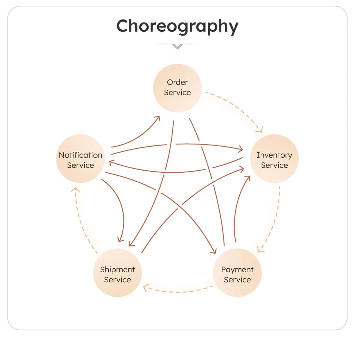 Choreography: In this pattern, the individual microservices consume the events, perform the activity, and pass the event to the next service. There is no centralized coordinator, making communication between the services more difficult: