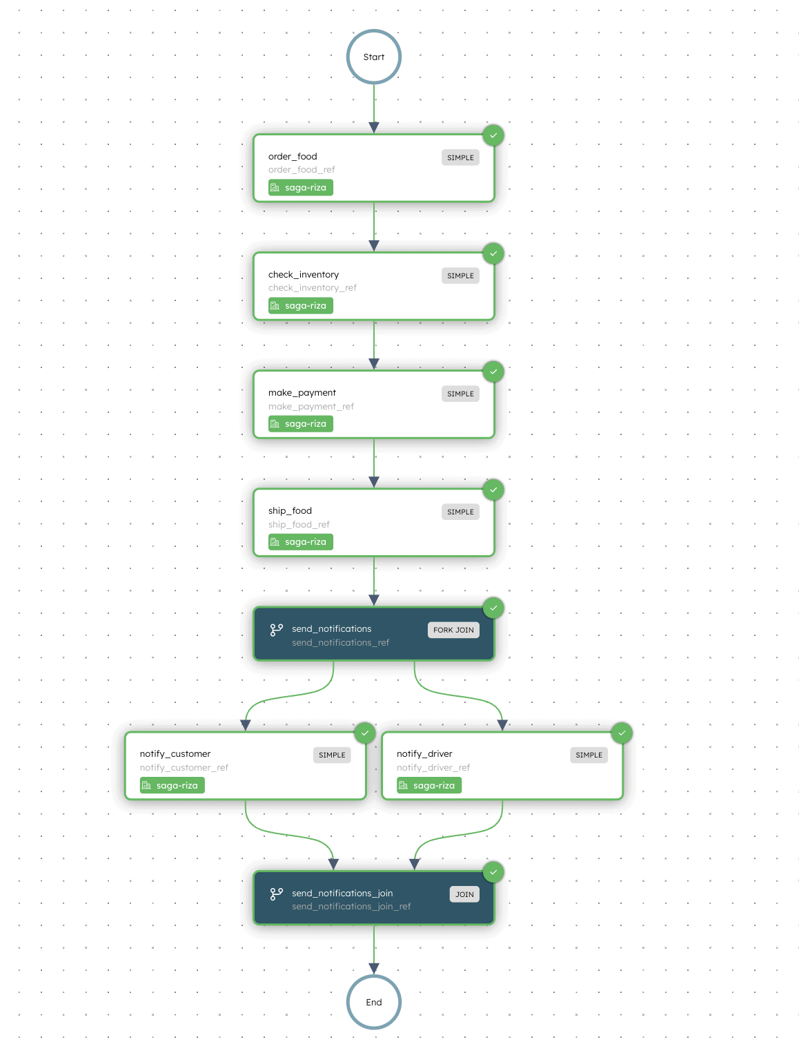 - The application flow then moves on to a fork-join task, which handles the notification service. It has two forks, one to notify the delivery person and the other to inform the user.
