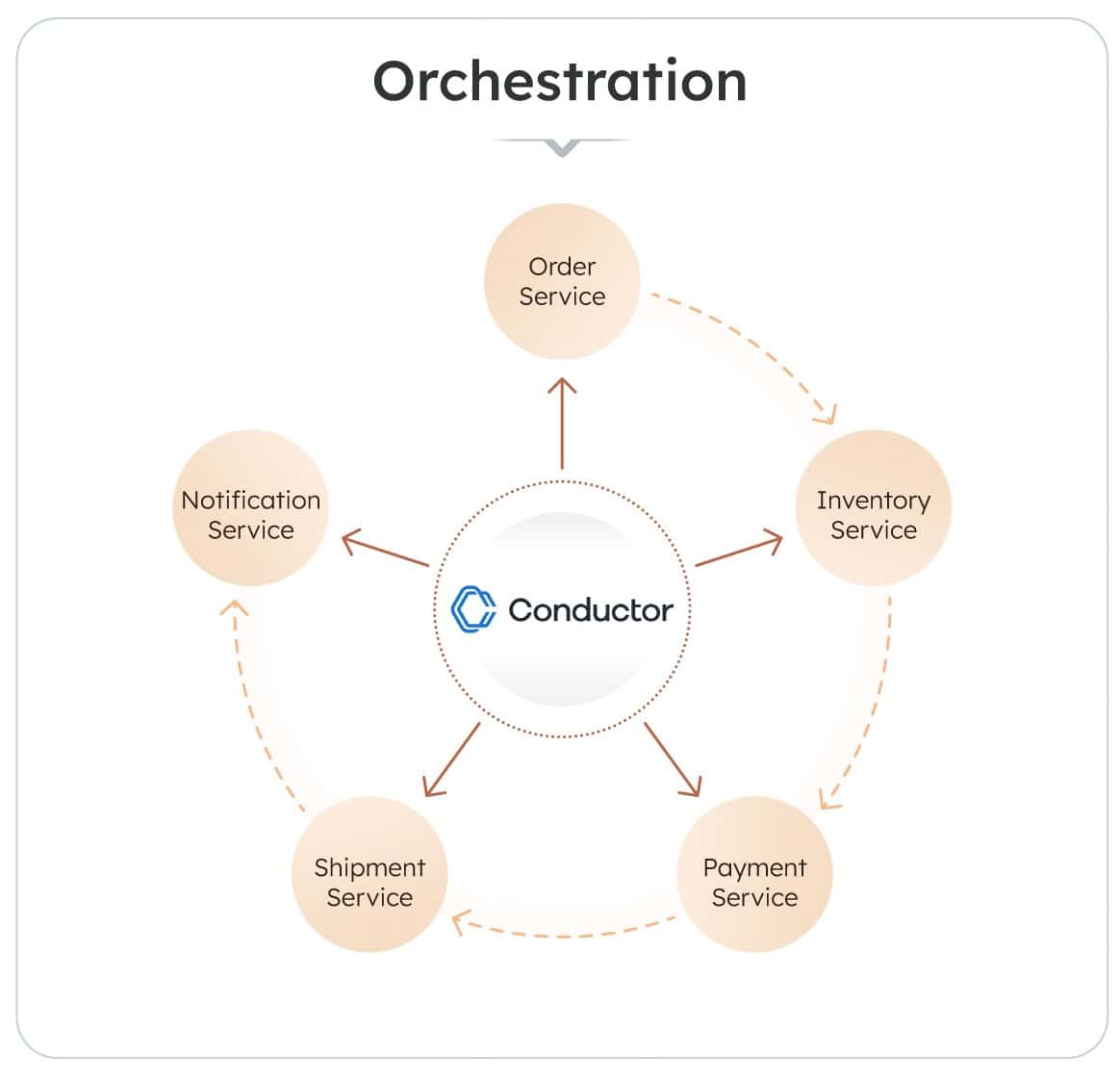 Orchestration: In this pattern, all the microservices are linked to the centralized coordinator that orchestrates the services in a predefined order, thus completing the application flow. This facilitates visibility, monitoring, and error handling: