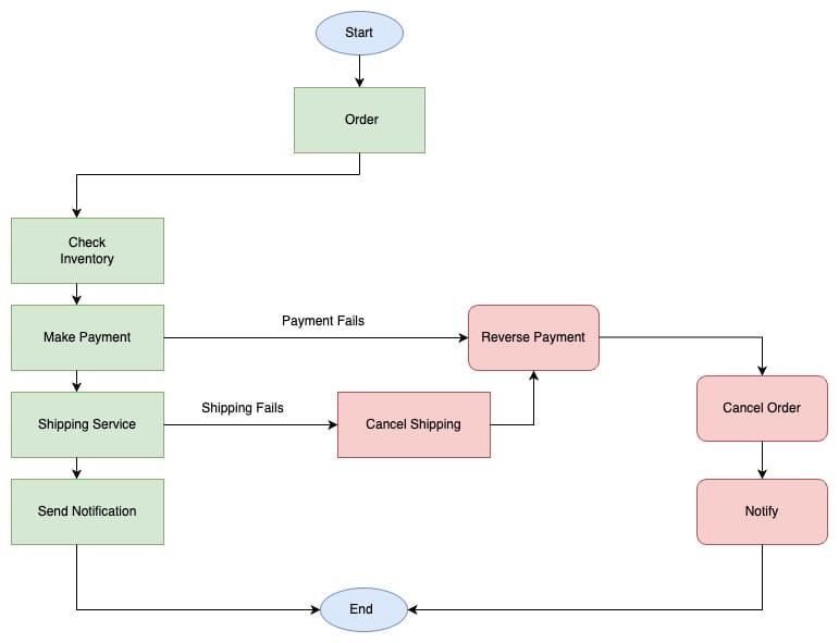 Let’s imagine that the payment fails due to insufficient funds. Then, the failure workflow triggers, initiating the compensation flow as follows: