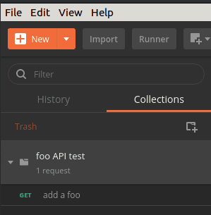 When the CREATE A NEW COLLECTION dialog appears, we can name our collection “foo API test“. Finally, we click the Create button to see our new collection appear in the list to the left: