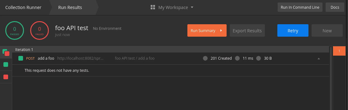Let’s make sure to save all of our requests, then hit Retry in the collection runner. As expected, our tests have failed: