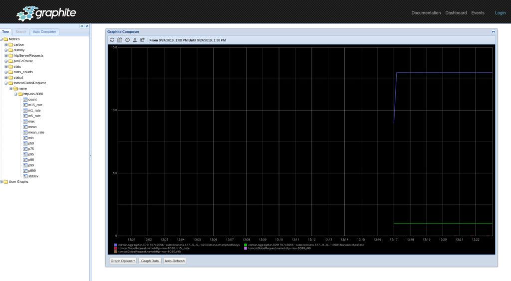 Like Prometheus, Graphite includes its own visualization dashboard. It is available at the URL http://localhost/.