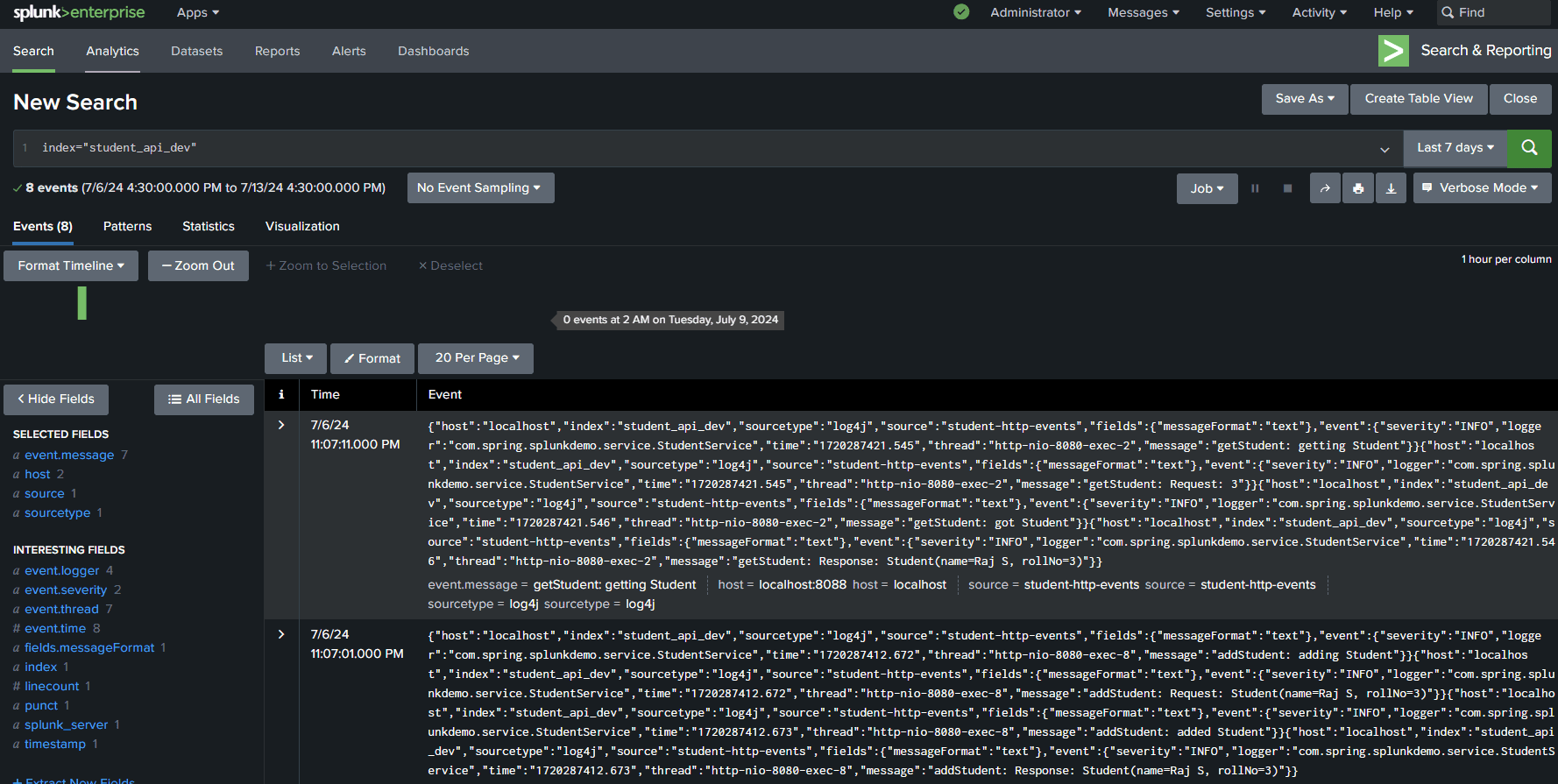 Let’s now run our application. Once it’s up and running, we can send requests to our API. After that, we can go back to Splunk and run this query: