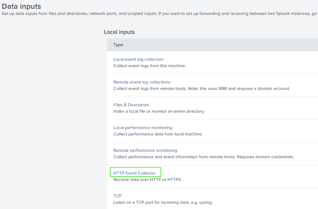 Let’s create an index in Splunk So that we can use those credentials in Spring Boot to direct logs from it. We can navigate to Settings (Top Right) -> Data inputs -> HTTP Event Collector as shown below: