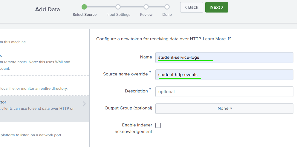 Here “Name” is a unique identifier for our token in the group of tokens and “Source Name Override” helps categorize our data based on its origin as well as Splunk uses it to determine how to index and search our data.