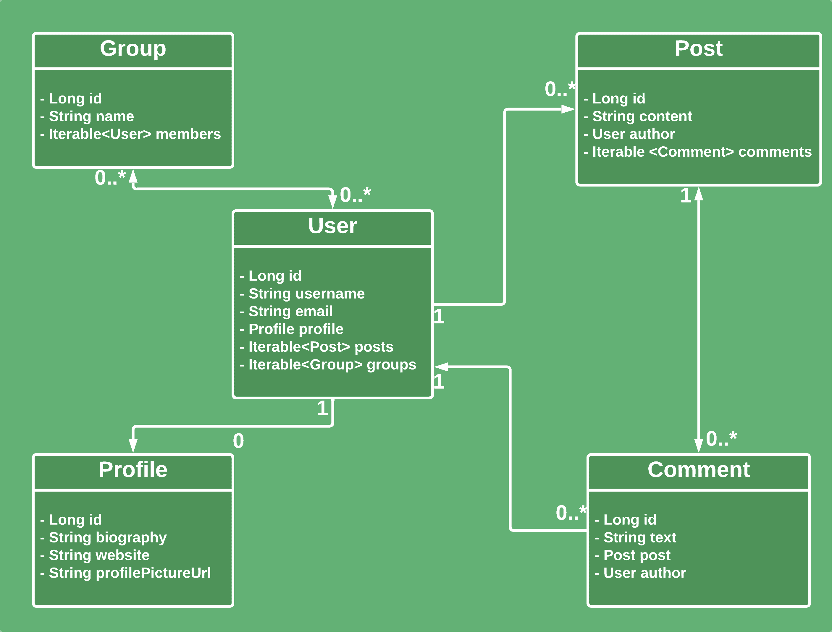 To make the examples more relevant and easier to follow, we’ll be using a model for a social networking website. We’ll have different relationships between groups, users, posts, and comments.