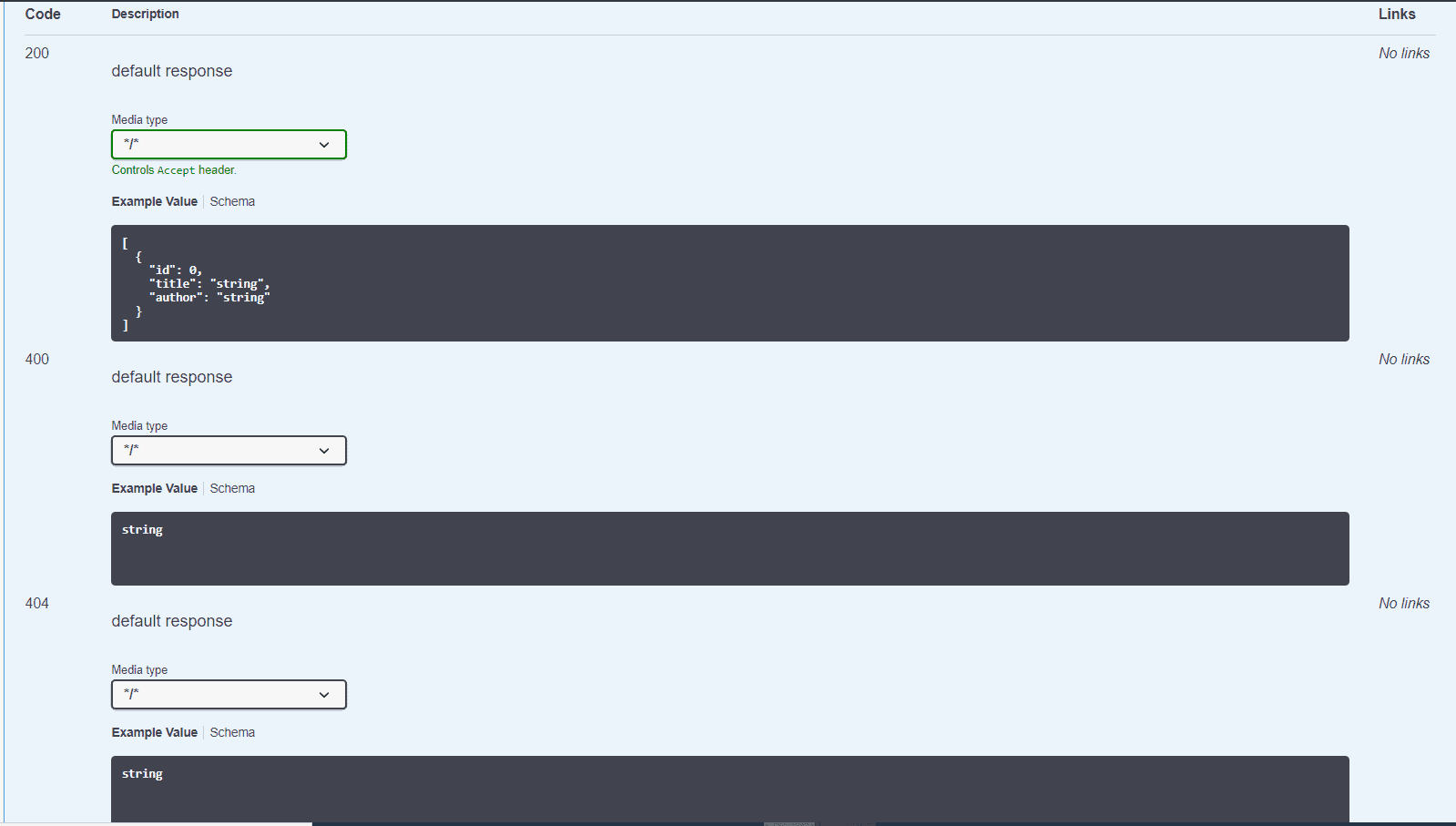 We do not get any schema for the responses 400 and 404 above. As we defined an empty @Content for them, only their descriptions are displayed.