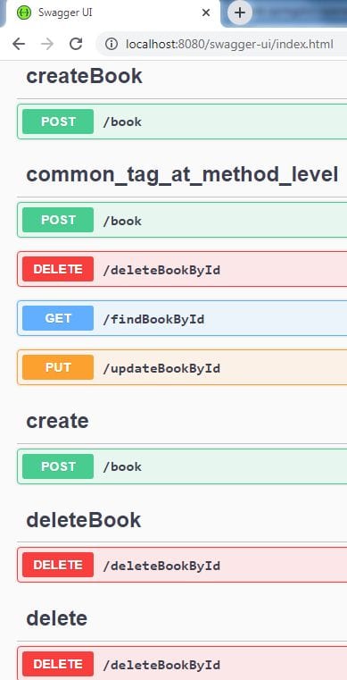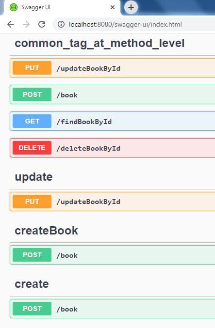 When we run the application, the Swagger UI (http://localhost:8080/swagger-ui.html) displays the tags according to its default display order, with some additional caveats taking precedence: