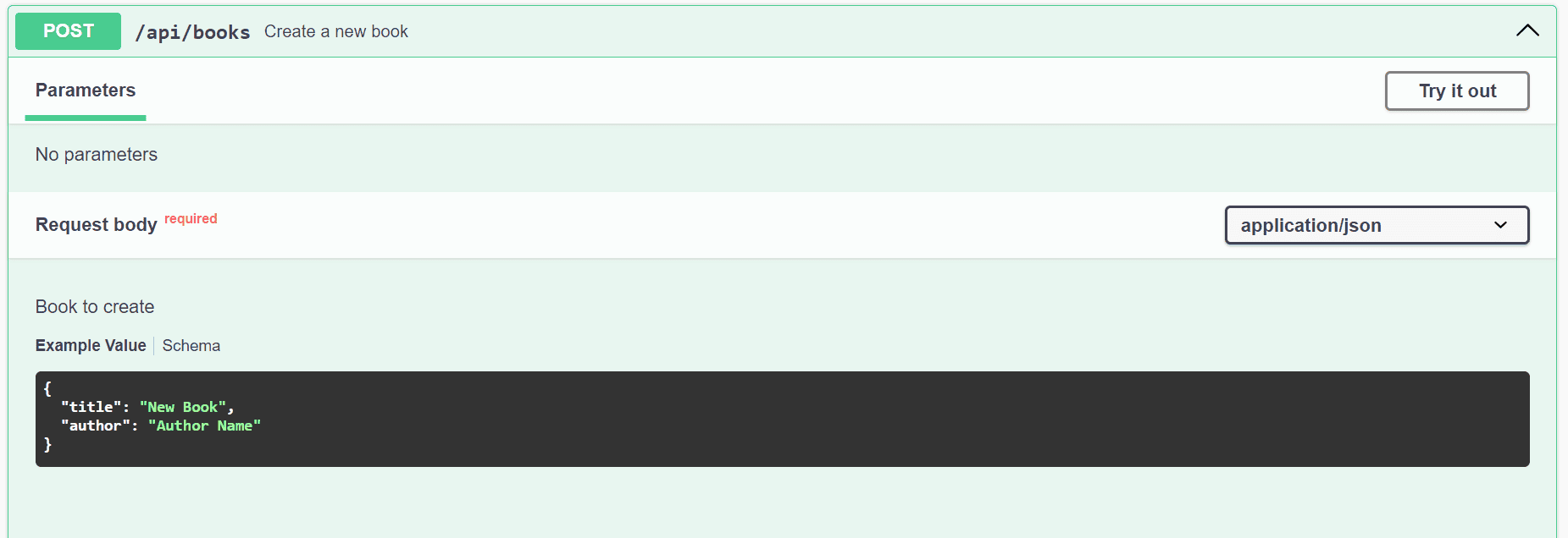 examples = @ExampleObject(value = "{ \"title\": \"New Book\", \"author\": \"Author Name\" }")))