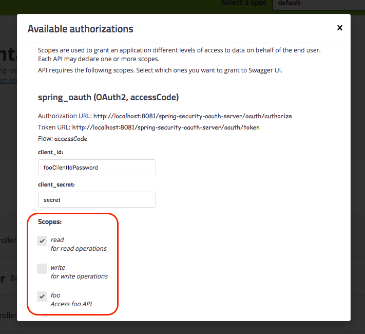 These sync up with the scopes we actually have defined in our application, for the /foos API.